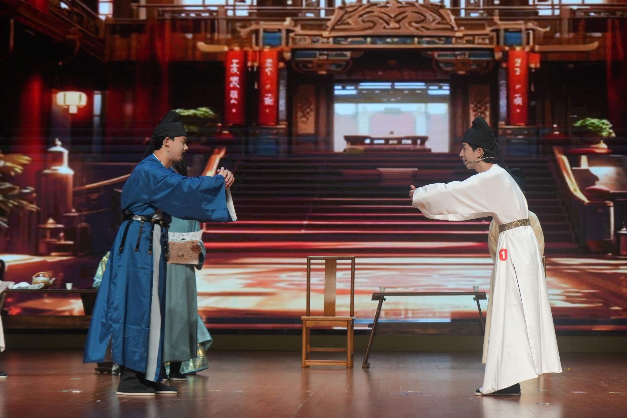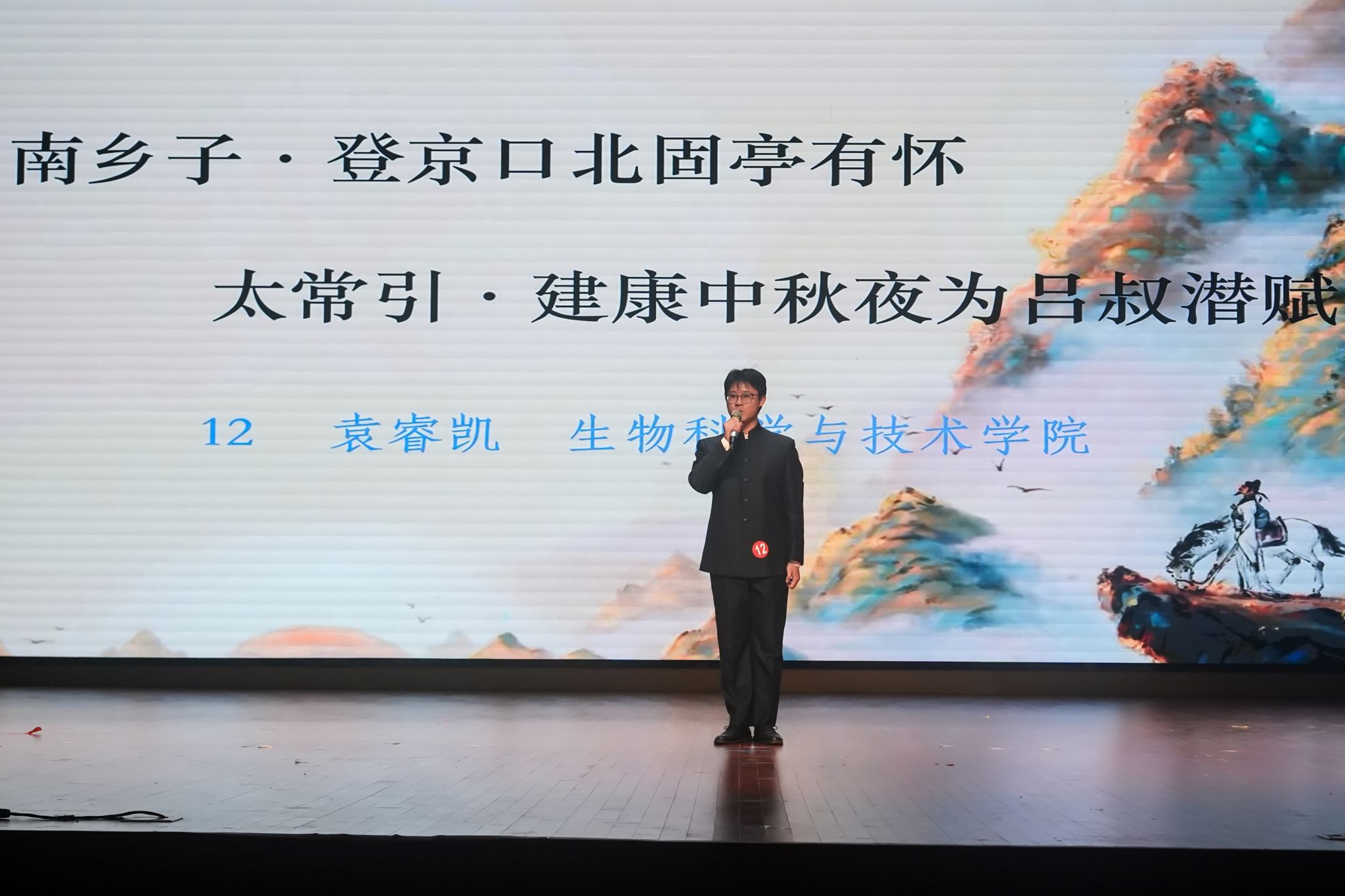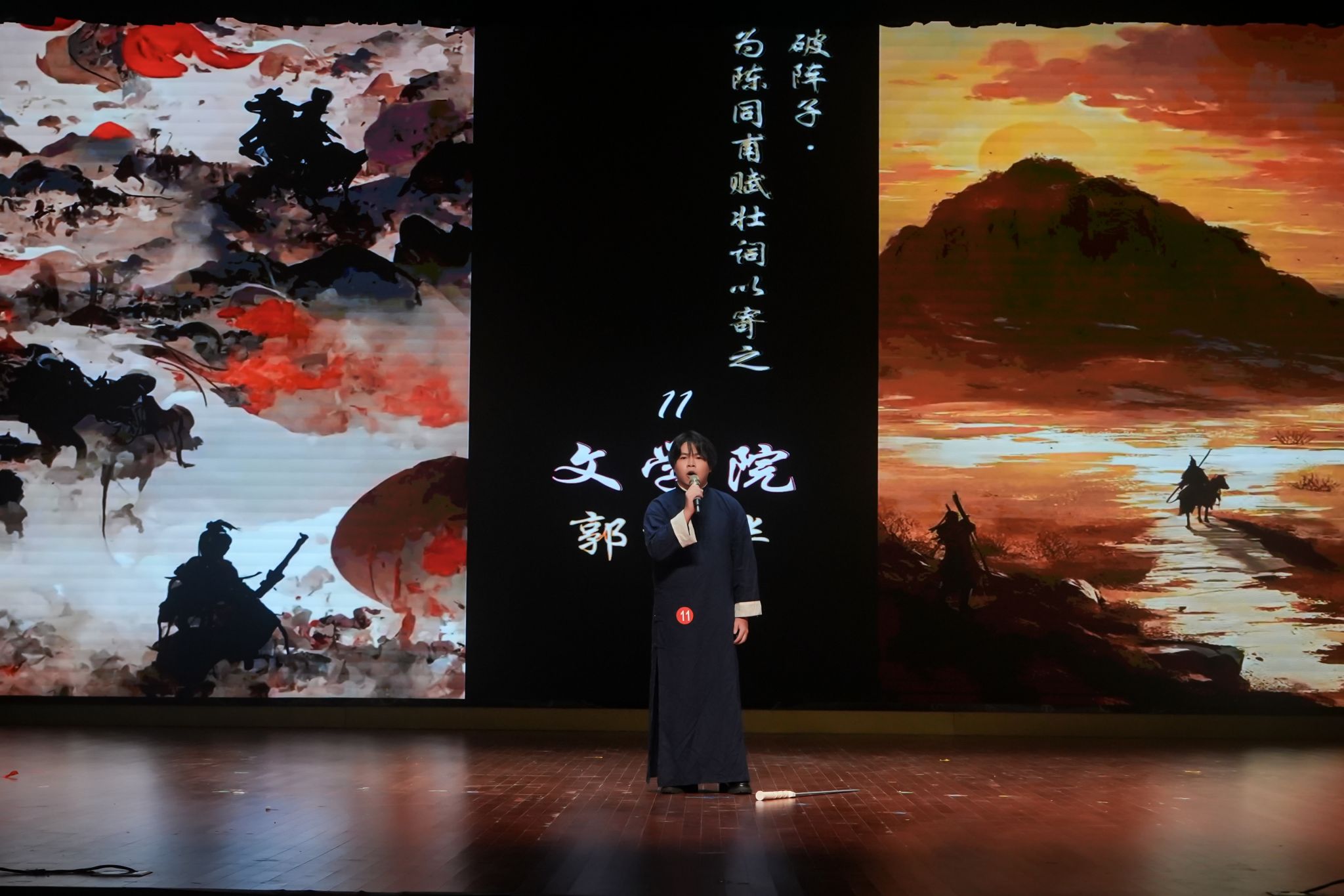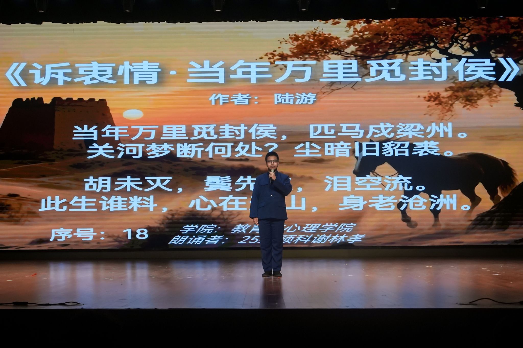 在2025“两赛”颁奖仪式结束之后,一场以“普通话诵经典”为主题的文化盛宴温情启幕,为校园染上了一层古典而雅致的色彩。此次晚会,不仅是一场诗词之间的交流,更是一次文化的传承与青春的礼赞。同学们通过诵读与演绎,与古人对话,与经典共鸣,让中华诗词的文脉在青春的声音与身影里不断延续、愈发璀璨。普通话诵经典宛如一条时光隧道,引领众人穿梭于不同的诗词时空。纪念李贺诞辰1235周年的诵读里,《天上谣》的缥缈在2号选手吴艳的演绎下,被赋予了新的生命,那浪漫的想象仿佛要冲破时空的桎梏。纪念辛弃疾诞辰885周年的篇章,满是爱国的赤诚与壮志的豪情。12号选手袁睿凯的《南乡子·登京口北固亭有怀》和《太常引·建康中秋夜为吕叔潜赋》似一把钥匙打开辛弃疾那热血与深情交织的内心世界。 在纪念陆游诞辰900周年的诵读中,14号选手陈锦雯的《秋夜将晓出篱门迎凉有感二首(其二)》《十一月四日风雨大作二首(其二)》,让同学们领略到诗人对山河的忧虑与报国的决心。芝山剧社带来的经典诗词课本剧《少年心事》演出则是另一种精彩世界:他们用生动的表演,将诗词中的文字转化为鲜活的场景,把少年的心事与情怀演绎得入木三分,让同学们在光影与表演中,更深切地感受到经典诗词的魅力。